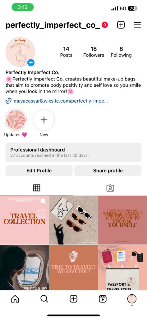 My market research showed that our target audience has a high prevalence of mental disorders as almost 2 in 5 people aged 16-24 have had a mental disorder. It also revealed that international travel by Australians is forecasted to increase by 40.1%. So we decided to remix our product by altering and repurposing our bags to create a new collection with a different objective that directly targets what our intended audience is actually using our product for. To do this we switched from makeup bags that promoted body positivity to travel bags that promote organisation and a healthy mindset. Perfectly Imperfect is also keeping the option for our consumers to design their own bags on my website so they can alter it exactly to their needs. We included this feature to hopefully improve our participatory culture. Once again we gained inspiration from Pinterest as we know it is a platform that our audience predominantly uses and is useful for finding inspiration.