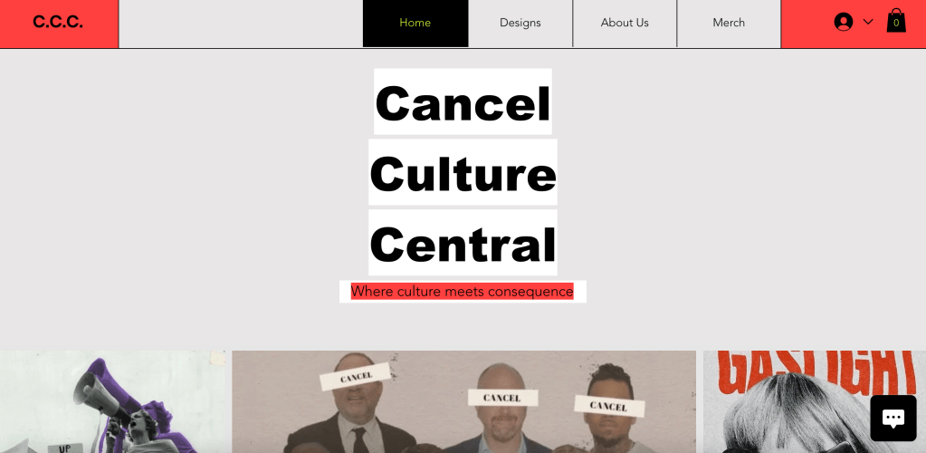 An additional platform we have is our website called Cancel Culture Central. I created this website to ensure our project is sustainable. On the site, there is a chat platform that allows people to discuss celebrities and influencers who have been cancelled as well as upload their own false information to observe who interacts and believes it. The website also ‘sells’ our merch t-shirts that represent cancel culture. People can also download our merch designs for free to create their own art.