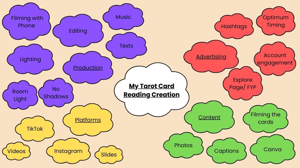 For my second round of content creation I first had to craft my Instagram content by utilising Canva to create visually enticing slides. The first slide introduced the topic “Tarot cards and pop culture”. This was then followed by examples I created linking the Major Arcana to popular movie characters. For instance, The Magician was paired with Marvel’s Doctor Strange, The Empress with Mufasa from “The Lion King,” and The Emperor with Darth Vader from “Star Wars.” Subsequently, I explored the Minor Arcana, illustrating Belle from “Beauty and the Beast” as the Ace of Cups, Eeyore from “Winnie the Pooh” as the Five of Cups, and the Weasley family from the “Harry Potter” franchise as the Ten of Cups.